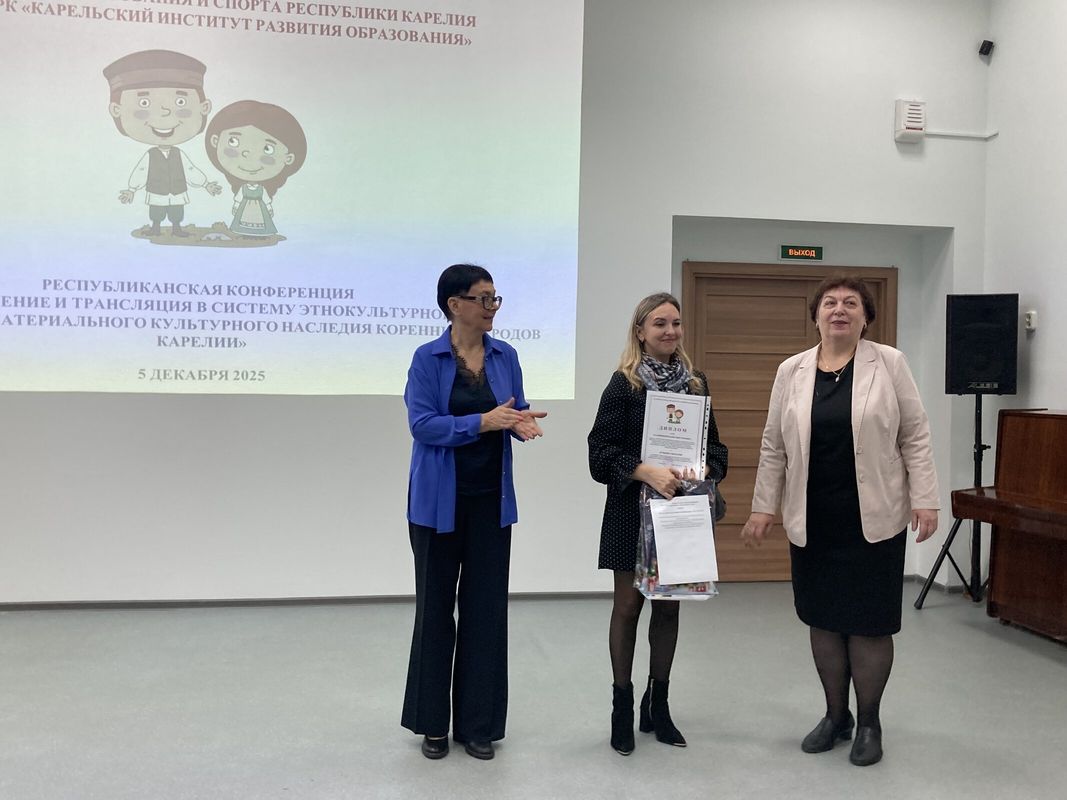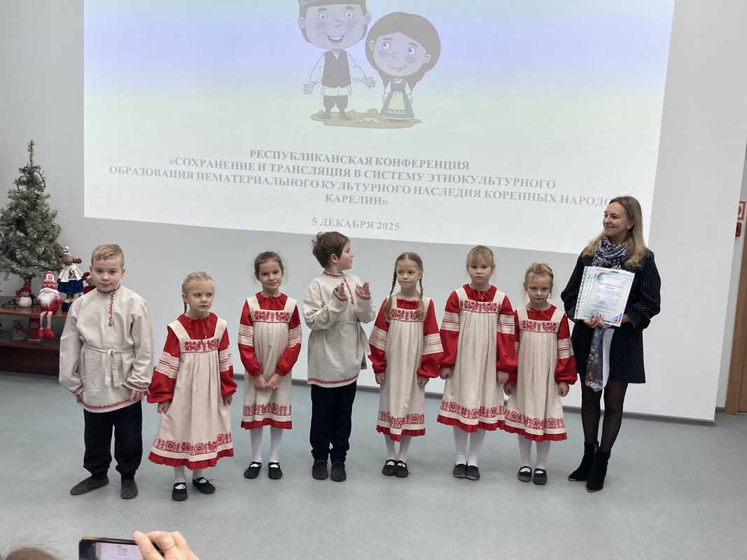 Дети и педагоги нашего детского сада были отмечены Дипломом «Лучший актерский ансамбль» 5 декабря на Республиканской конференции «Сохранение и трансляция в систему этнокультурного образования нематериального культурного наследия коренных народов Карелии» в номинации «Дошкольный читательский театр» Республиканского конкурса на лучшие учебно - методические материалы по карельскому, вепсскому и финскому языкам 2025 года. Выпускники 2025 года нашего детского сада выступили на конференции с музыкальным приветствием, они продолжают творчески проявлять себя в фольклорно - хореографическом ансамбле "KULKUSET" Поздравляем Юлию Викторовну, Елену Александровну, Викторию Леонидовну и детей группы «Рябинка» за победу!